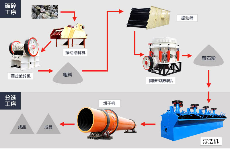 螢石礦的選礦工藝需根據(jù)礦石性質以及客戶要求精礦品位等多方面的因素制定,一般要求冶金級螢石精礦的選礦只需經過手選,重選即可,對于酸級化工行業(yè)用螢石精礦粉的制取需要采用浮選的方法獲得,該工藝通過手選,球磨,分級,重選,浮選聯(lián)合工藝處理螢石礦,具有較強的代表性。